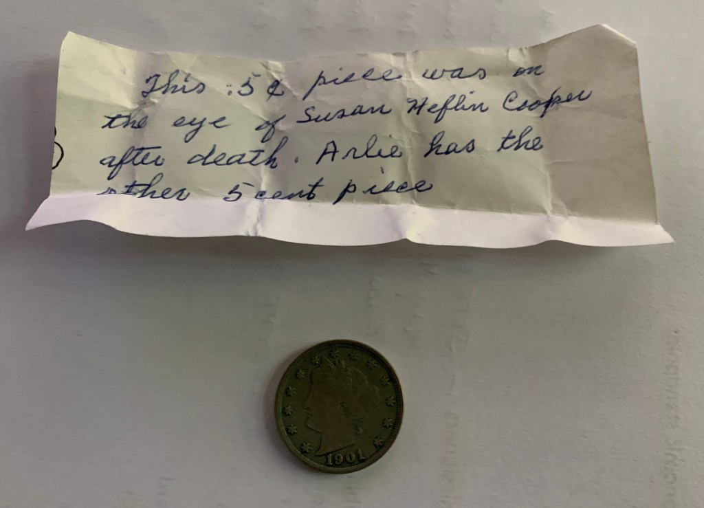 About 15 years ago, my friend Ken Farmwald and I started a company to buy, fix-up and sell houses. On a good day, we do it for a profit. As we were cleaning and doing the demolition at a house this summer, we found a nickel wrapped in a tiny piece of paper, on which was written, “This 5¢ piece was on the eye of Susan Heflin Cooper after death. Arlie has the other 5 cent piece.” After finding the note and 1901 coin, I did an internet search for Susan and located her grave at the Gnats Run Cemetery near Pennsboro, West Virginia.